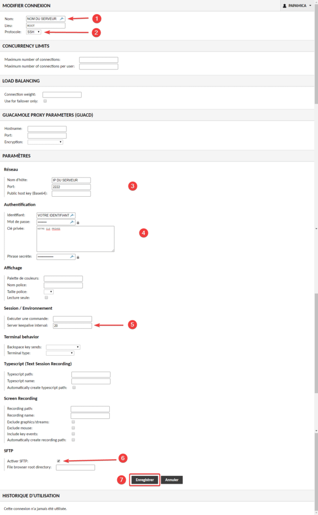 Avec Apache Guacamole, vous pouvez aussi prendre la main sur un serveur avec un accès SSH, de la même façon, rendez-vous dans la catégorie « Connexions » :