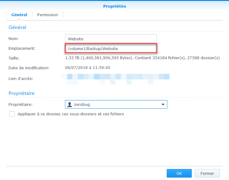 Dans mon cas, les sauvegardes sont hébergés sur /Volume1/Backup/Website
