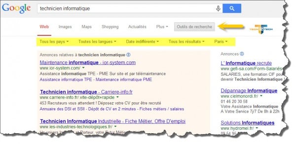On commence par la base, l’une des fonctions les plus connues. Cela consiste à utiliser les guillemets pour rechercher une expression exacte. Par exemple avec la recherche « Technicien informatique » la recherche sera exécutée uniquement sur Technicien informatique et non-Technicien en Informatique par exemple.