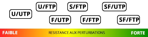 Et le blindage alors ? Bah ouais, ça aussi c’est important en fonction de la où vous ferez passer le câble. Attention, éviter de passer le courant fort avec votre câble RJ45 et si ce n’est pas possible autrement, choisissez le bon type de blindage.