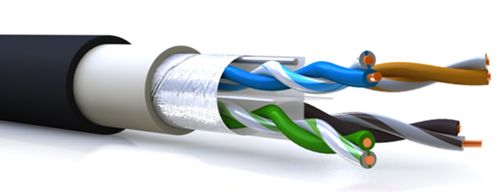 - Shielded foiled twisted pair (SFTP) – (Dénomination officielle SF/UTP – Paire torsadée écrantée et blindée). Câble doté d’un double écran (feuille métallisée et tresse) commun à l’ensemble des paires. Les paires torsadées ne sont pas individuellement blindées.