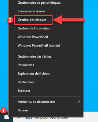 - Si elle n’apparait pas dans le poste de travail, faites un clic droit sur le « menu démarrer » puis « gestion des disques ».
