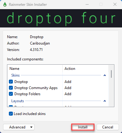 Télécharger Droptop (barre macOS pour Windows)Cliquez alors sur « Install » pour lancer l’installation du skin.