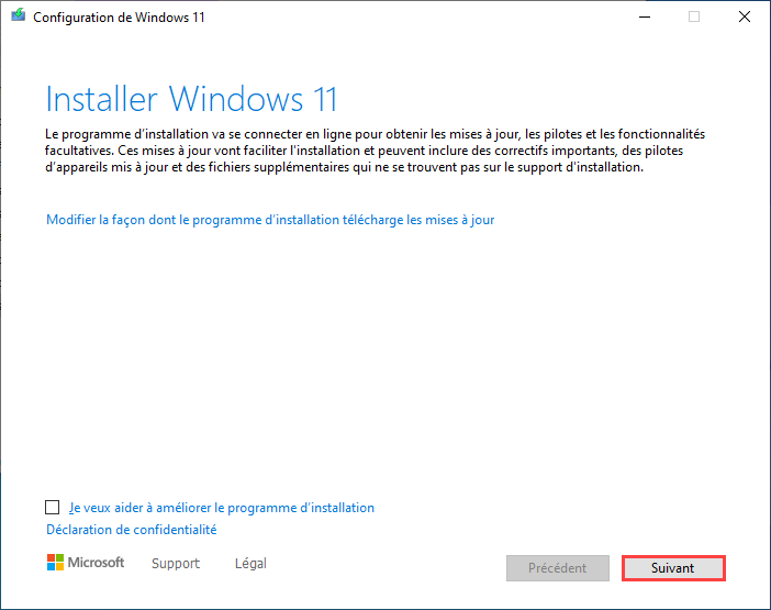 - Le programme d’installation de Windows 11 se lancera. Cliquez sur Suivant.