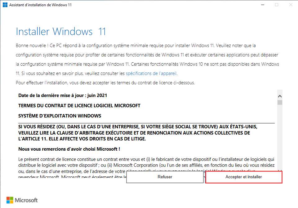 Assistant d’installation de Windows 11- Depuis votre ordinateur, exécuter l’assistant d’installation de Windows 11. Cliquer sur Accepter et installer pour commencer.