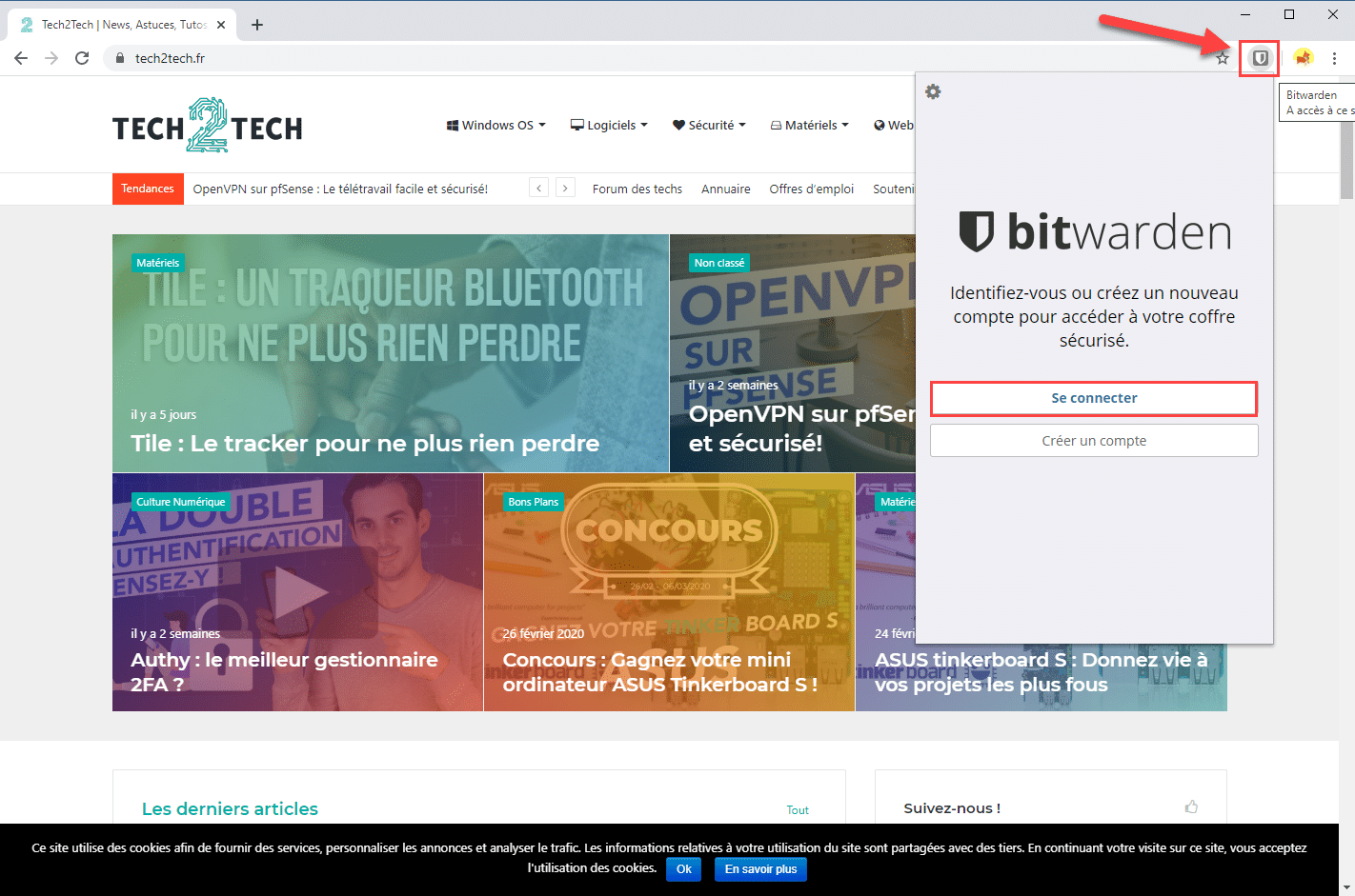 Pourquoi je pense que l’idéal est d’utiliser l’extension pour votre navigateur ? Et bien simplement, car il vous permettra de vous connecter automatiquement sur tous les sites web ou vos identifiants ont été enregistrés sur Bitwarden. Mais aussi de sauvegarder tous vos mots de passe lors de vos connexions aux sites web.