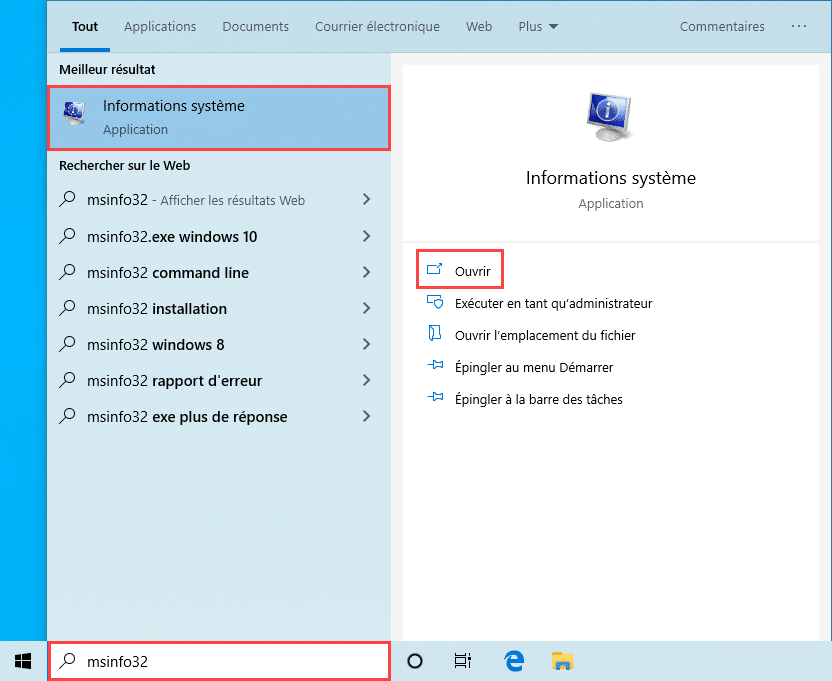 Cliquez sur Démarrer, puis taper « msinfo32 », ouvrez l’application Information Système.