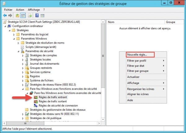Dans la console de gestion des stratégies de groupe, développez configuration ordinateur > Paramètres Windows > Paramètres de sécurité > Pare-feu Windows avec fonctions avancées de sécurité. Effectuer un clic droit sur Règles de trafic entrant et créer une nouvelle règle…