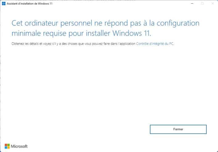 Cet ordinateur personnel ne répond pas à la configuration minimale requise pour installer Windows 11.