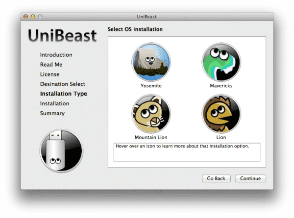 Télécharger Unibeast puis lancer le programme depuis OSX. Cliquez sur « Continuer » puis accepter l’accord.