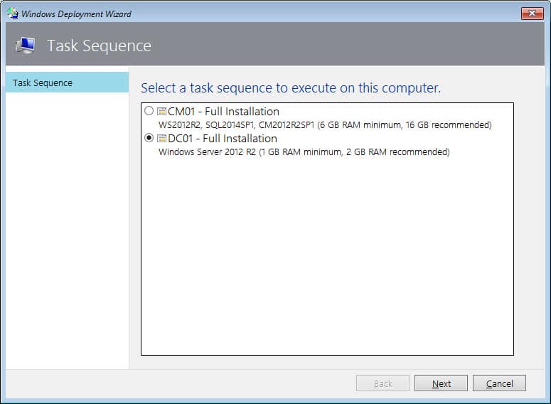 - Démarrer la machine virtuelle DC01. Démarrer sur l’iso précédemment créée HydrationCM2012R2SP1_U1.iso, lors de la Task Sequence, sélectionner le déploiement de DC01.