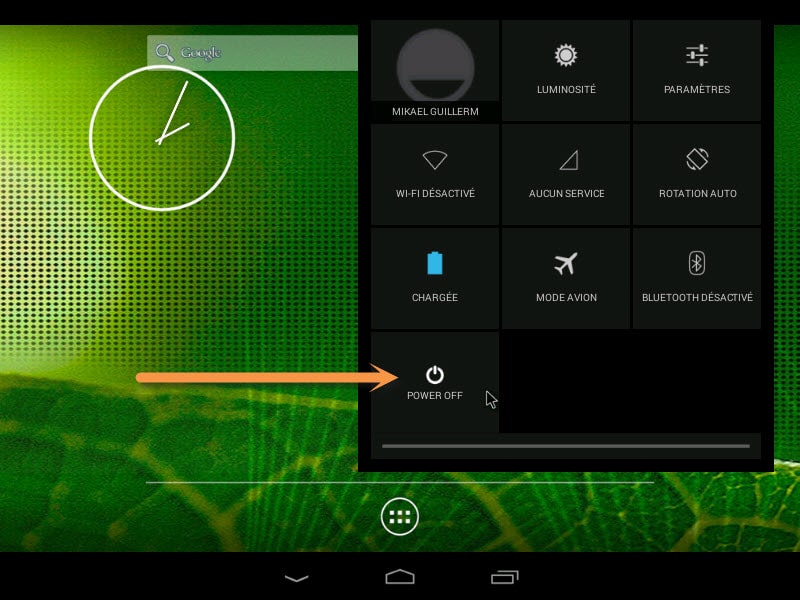 Il est préférable d’éteindre proprement votre machine virtuelle. Pour cela, cliquez sur le bord supérieur droit votre système Android et faites glisser vers le bas de l’écran. Un menu va apparaitre. Ici, cliquez sur « Power Off »