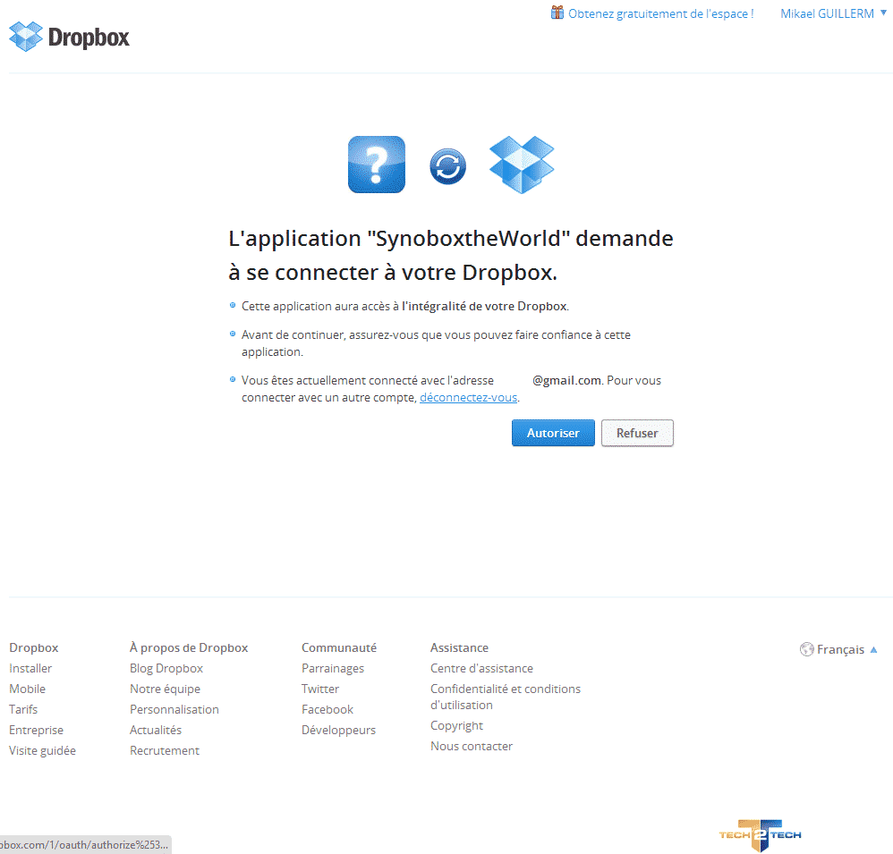 Vous serez redirigé sur une page qui vous demandera d’autoriser l’accès à votre Dropbox par l’application que vous venez de créer. Cliquez sur « Autoriser »