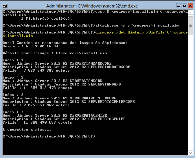 Ensuite, il faut récupérer l’index de la version de Windows Server que vous utilisez. Pour cela on lance la commande suivante :