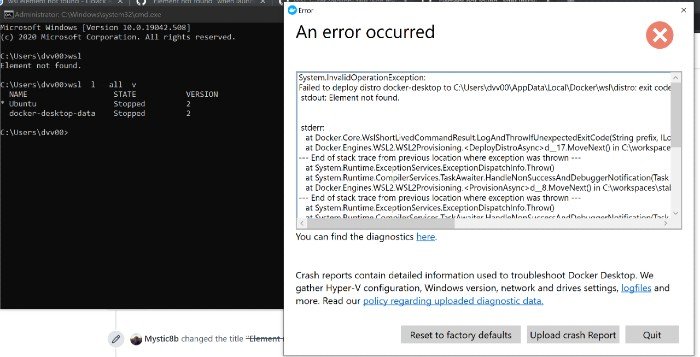 En effet, de nombreux utilisateurs se plaignent depuis hier de ne pas pouvoir lancer WSL2, à la place ils ont un joli message d’erreur « An error occurred. Element not found » avec comme information « Process exited with code 4294967295 ». Bref, rien qui puisse nous aider…