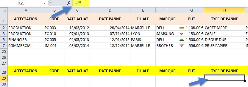 Regardez la barre de formule car on ne voit rien dans la zone de critère puisque l’on met une formule qui dit = champ vide.