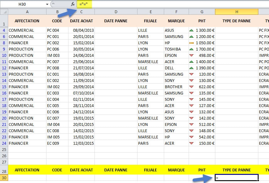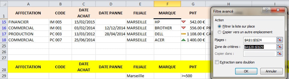 Exemple, si je veux toujours avec notre base Matériel extraire la filiale Marseille dans son intégralité, et toutes les autres filiales dont la somme est supérieure ou égale à 500 € je ne peux pas le réaliser en filtrant simplement.