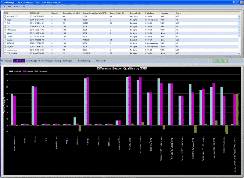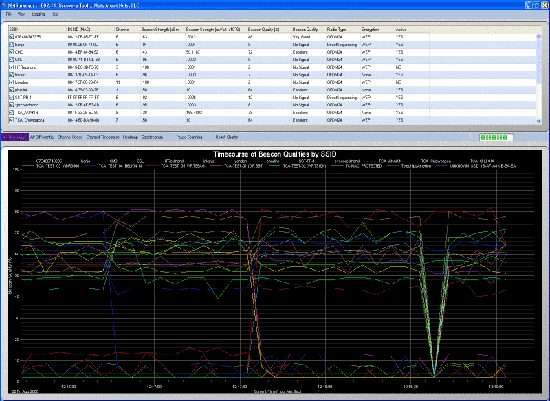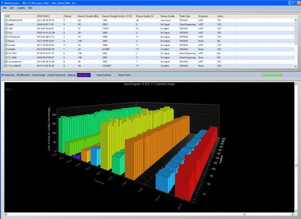 NetSurveyor fournit des statistiques en temps réel, avec des graphiques qui énumèrent tous disponibles réseaux Wi-Fi à portée. Pour tous les réseaux à portée, le SSID du réseau, BSSID (MAC), le canal, la puissance, la qualité du signal, le type de WiFi, l’activité et l’état de cryptage (si le réseau est crypté ou non) sont affichés en haut de l’interface principale .