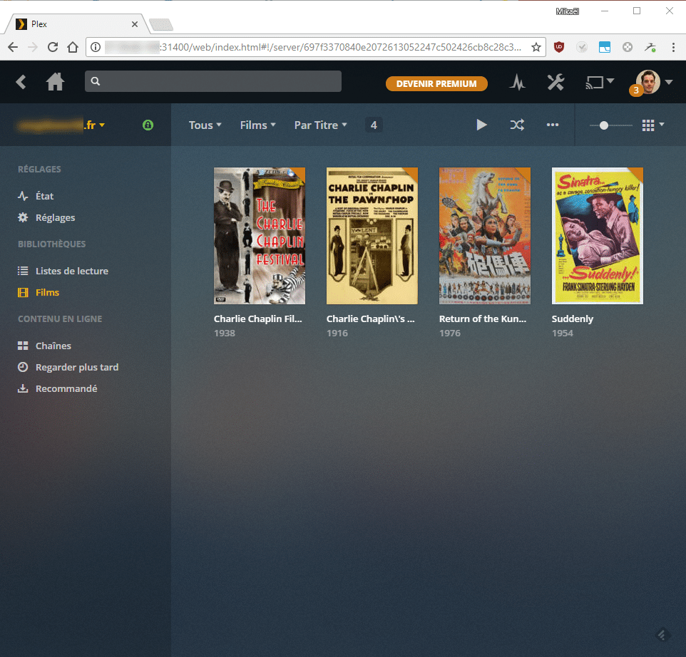 Une fois vos bibliothèques configurées, vous pouvez maintenant accéder à Plex, et visionner vos films.