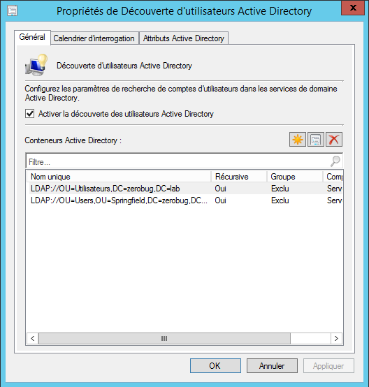 Cette méthode permet la découverte des utilisateurs de votre Active Directory. Cette méthode fait partie des méthodes indispensables, en effet, si vous souhaitez déployer des applications en ciblant des utilisateurs, alors vous aurez besoin de votre base utilisateurs AD. Par défaut cette méthode n’est pas activée. Il est nécessaire de l’activé en cochant la case prévue à cet effet (Activer la découverte des utilisateurs Active Directory).