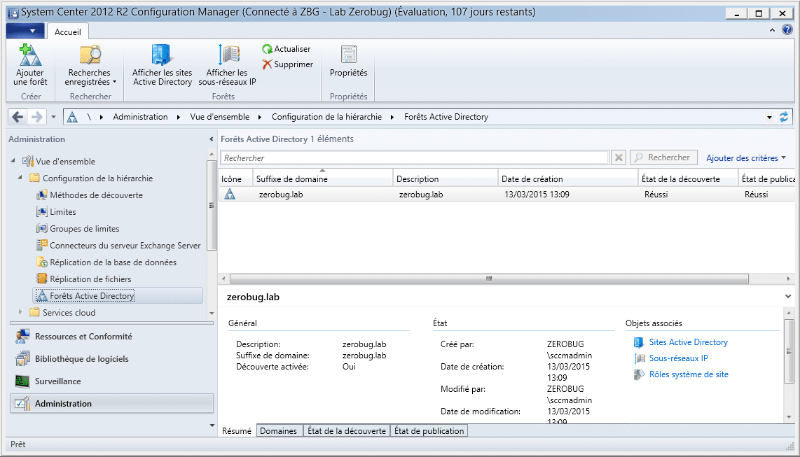 Comme son nom l’indique, cette méthode permet de découvrir les sites et sous-réseaux Active Directory. Par défaut, le serveur de site découvre la forêt dans lequel il est installé. Vous pouvez retrouver ces infos dans la partie « Administration > Vue d’ensemble > Configuration de la hiérarchie > Forêts Active Directory »