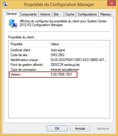 Si l’installation de la mise à jour a fonctionné pour votre client, vous devriez vous retrouver en version 5.00.7958.1501 (visible depuis panneau de configuration > Configuration Manager)