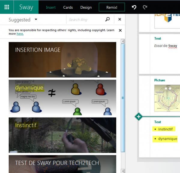 Sway, intuitif, suggère même des présentations, des mises en page après avoir analysé votre contenu.