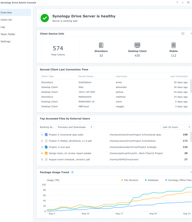 La console d’administration Synology Drive a été améliorée afin de facilite le dépannage et le monitoring