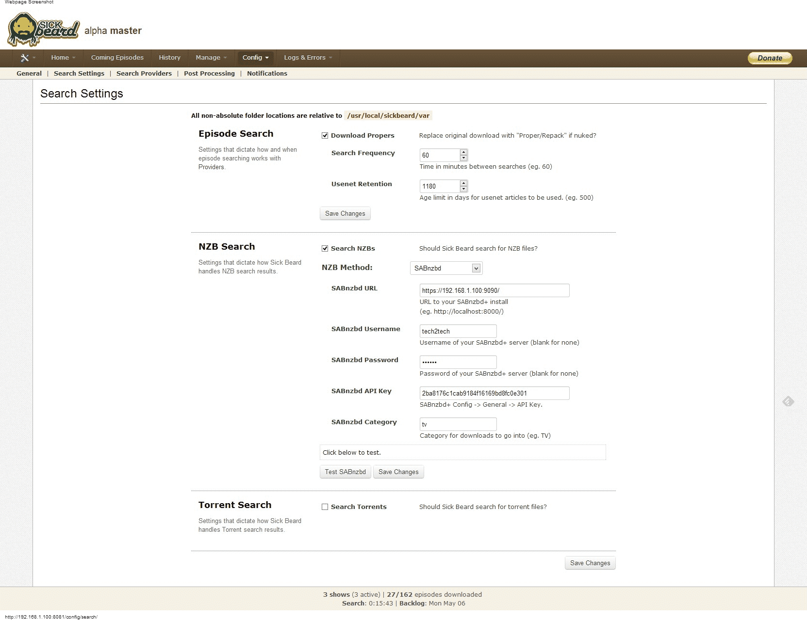 Dans « Search Setting », on va configurer les options de recherche des épisodes de vos séries. Comme la fréquence de recherche des épisodes, la rétention de vos newsgroups, mais aussi, et surtout à l’aide de quelle application on télécharge les épisodes. Personnellement j’utilise les news groups, et surtout SABnzbd. Vous trouverez donc ci-dessous, comment est configuré mon serveur SickBeard avec SABNzbd. Il faut entrer l’adresse de votre serveur avec l’adresse ip et surtout le bon port. Ensuite, votre couple de login/mdp si vous en utilisez pour vous authentifié sur SabNzbd. Et bien entendu la clé API de SabNzbd, vous pouvez trouver cette clé sur votre serveur SABNZBD dans la configuration. Ensuite on test la connexion à SABnzbd, et si cela se passe bien on peut passer à la suite : « Search Providers »