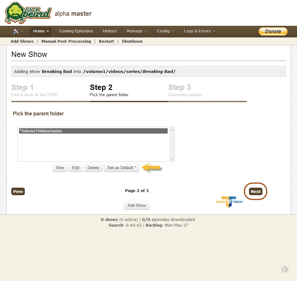 Ici, nous allons définir le répertoire dans lequel sera téléchargé la série, ici /volume1/videos/series/ si vous pensez toujours utiliser ce répertoire, alors cliquez sur « Set as Default« , vous pouvez alors valider en cliquant sur « Next »
