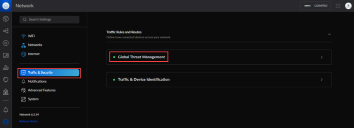 Pour cela, direction « Traffic and Security« , puis « Global Threat Management« , c’est ici que vous trouverez la configuration du Pare-feu.