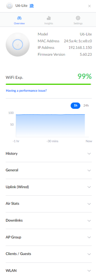 Wifi Experience : L’expérience Wifi permettra d’avoir une idée sur l’état général du Wifi fourni par cet AP, vous pouvez par exemple avoir de mauvais résultat si l’ensemble de vos appareils est en limite de signal. Globalement on ne trouve pas vraiment comment est calculée l’expérience Wifi, mais sur le forum Ubiquiti on parle du calcul suivant 😉