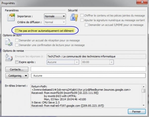 Une boite de dialogue s’ouvre et vous permet de choisir de ne pas archiver cet élément :