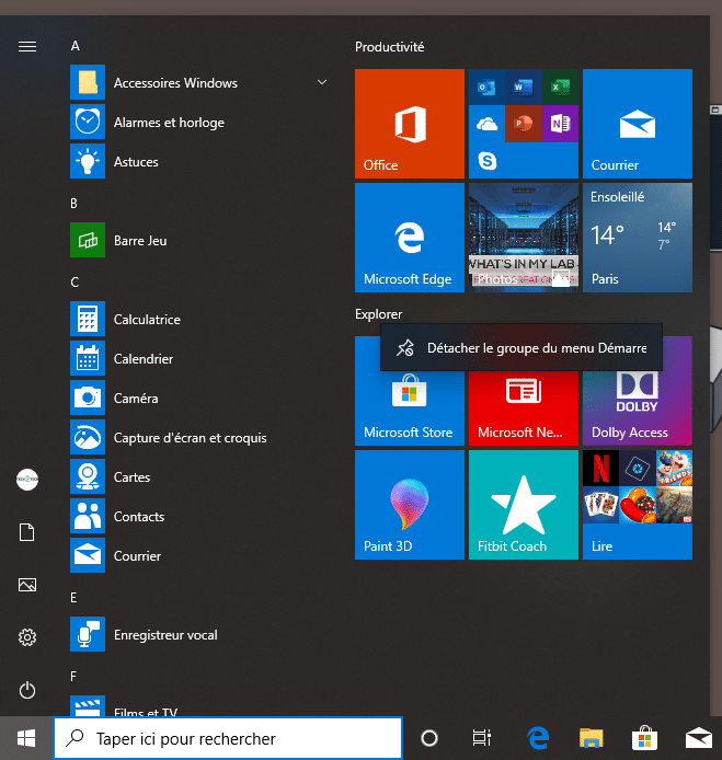 Par défaut on est maintenant sur un menu plus compact (une colonne au lieu de deux auparavant) et moins fouillis. Vous pouvez maintenant effectuer un clic droit sur une en-tête de groupe pour détacher tout un groupe de tuiles.