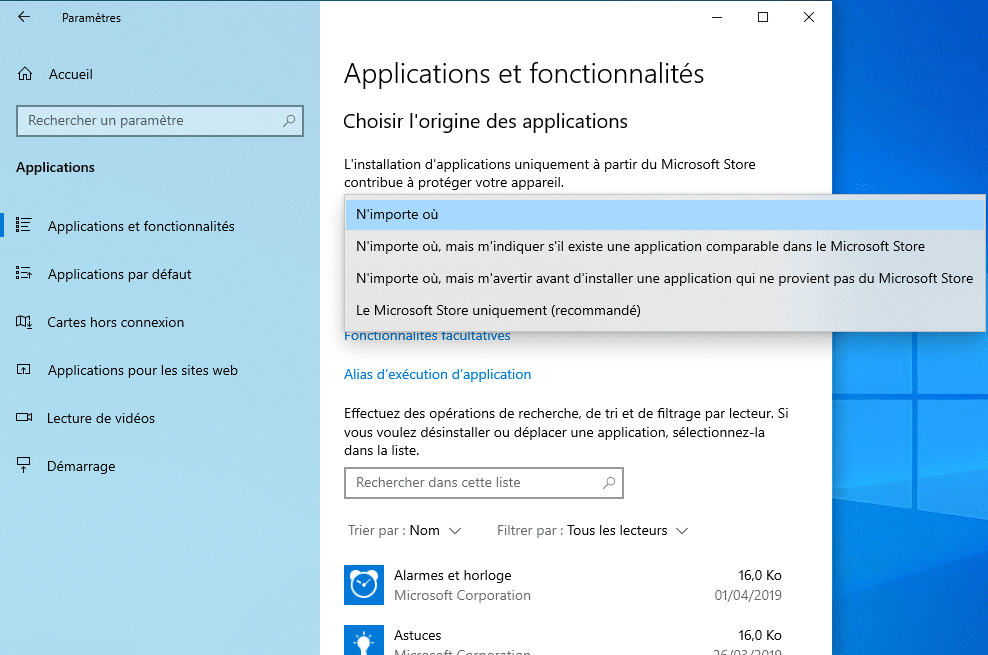 Ainsi, votre ordinateur autorisera l’installation de vos logiciels seulement depuis le Microsoft Store, ou depuis n’importe où.