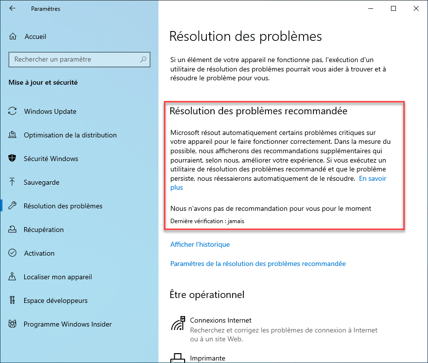 Si vous souhaitez voir les problèmes résolus par Windows 10, vous pouvez cliquer sur le lien « Afficher l’historique »