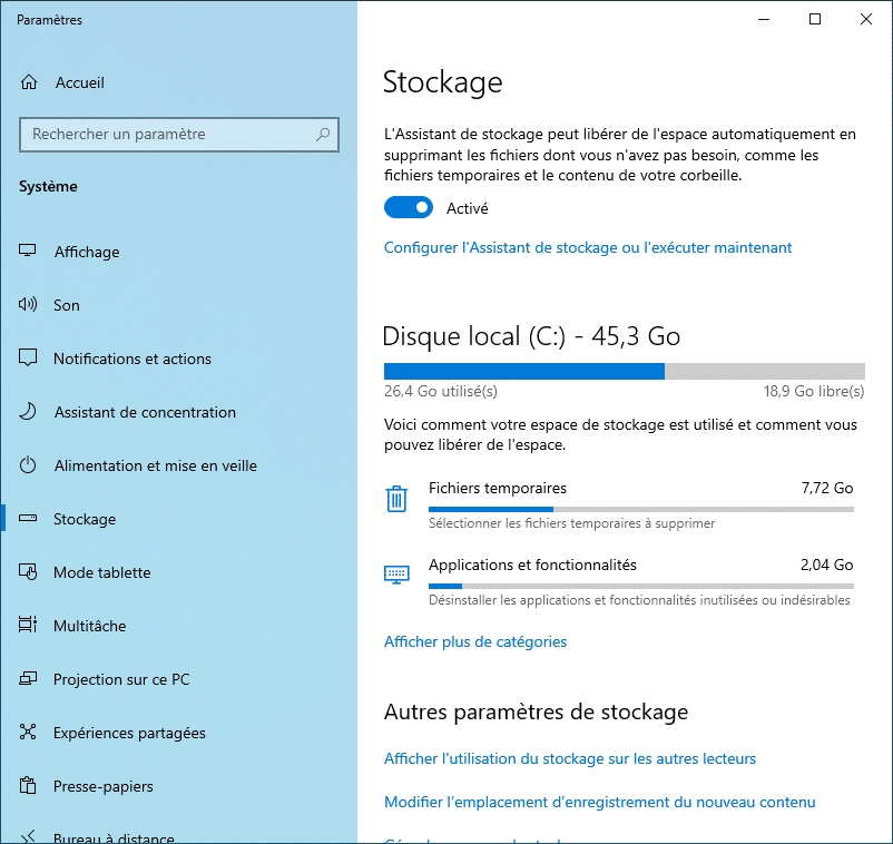 Cette page a été remodelée pour que l’on puisse voir tout ou presque en un seul coup d’œil l’espace disque utilisé. Avant il était nécessaire de sélectionner le lecteur pour avoir toutes ces informations.
