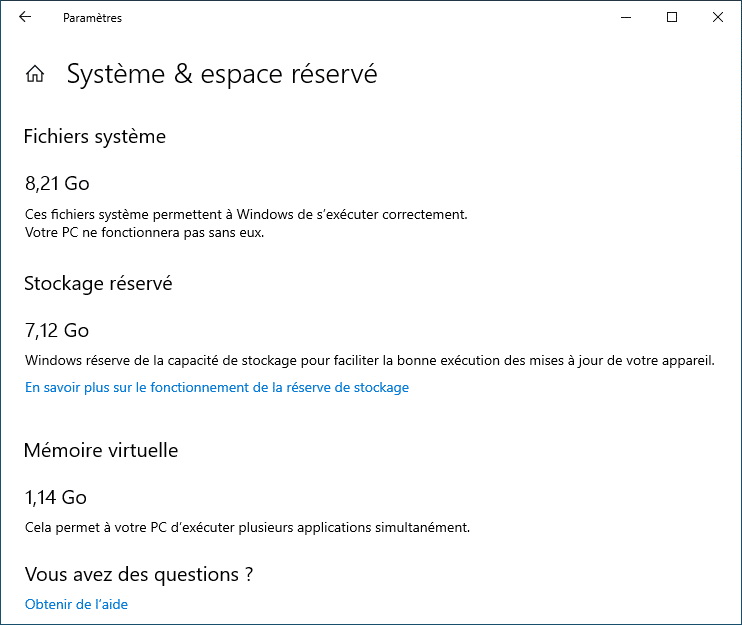 À partir de Windows 10 version 1903, Microsoft introduit un «Stockage réservé», une nouvelle fonctionnalité qui met de côté une partie du stockage disponible sur votre appareil afin de réduire les problèmes de mise à niveau vers une nouvelle version ou d’installer des mises à jour à la suite d’un nombre insuffisant d’espaces disque.
